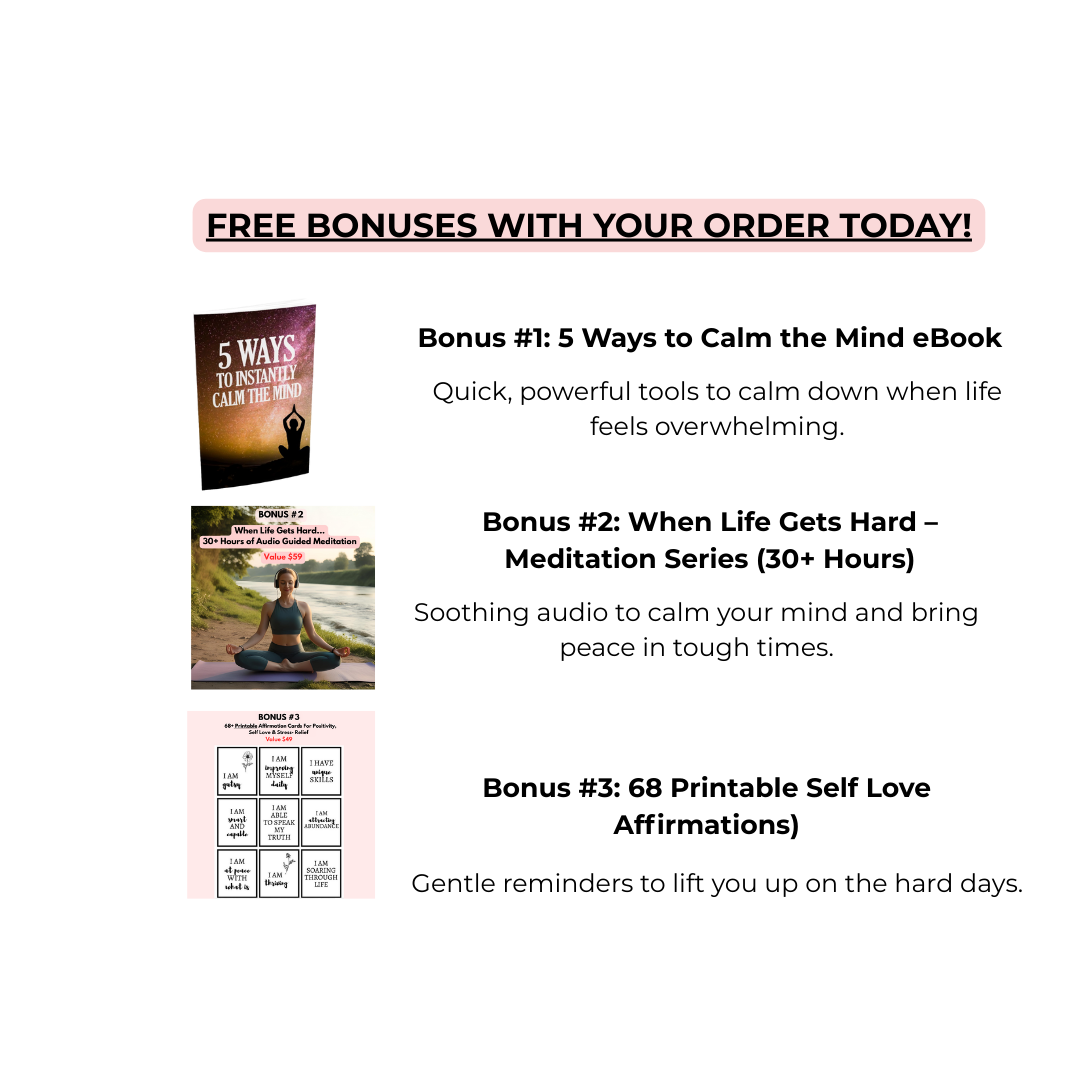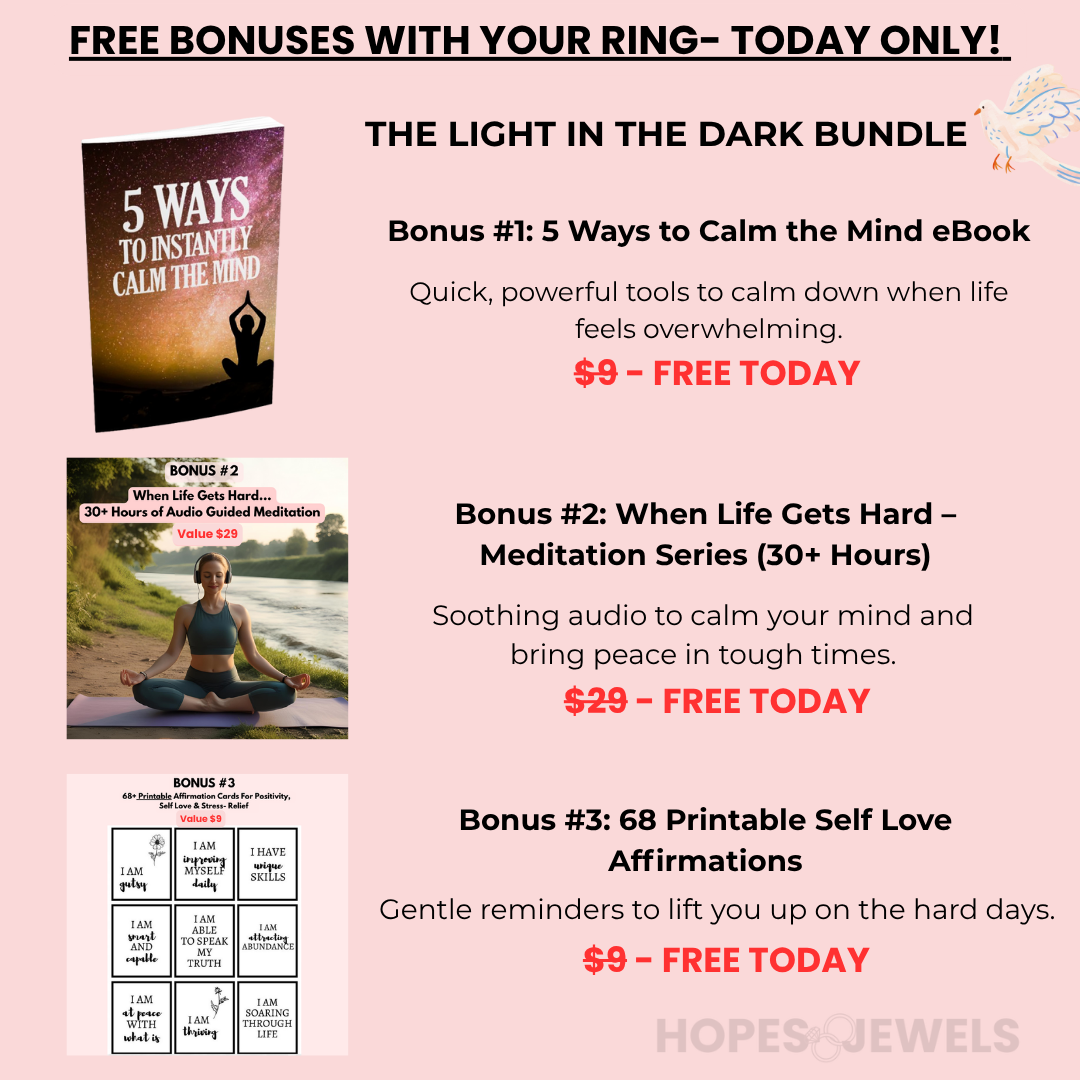 Get the Light in the Dark Bundle worth $46- free with your ring today only — a comforting collection of calming tools and uplifting reminders to help you or a loved one through life’s toughest moments.