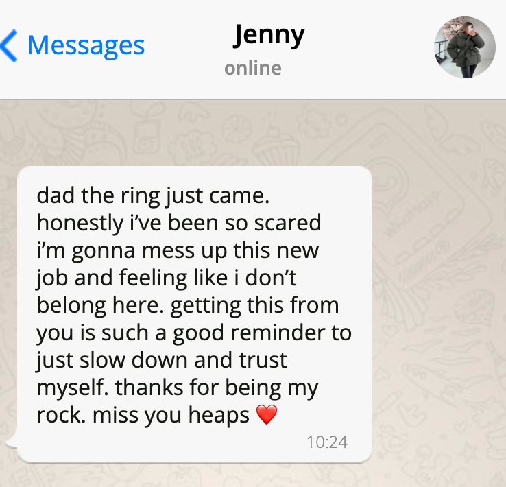 "I was terrified of buying a ring online because I didn't know her size, but the adjustable band is genius. It fits all her fingers perfectly. She says she looks at it whenever she feels anxious at college. It’s beautiful. She cried while reading the card.